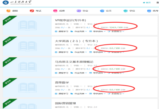 所有学习行为都将累计学习时间。当累计时间达到500分钟时,系统自动记录在线学习积分30分并计入期末考试总成绩。在主页上每门课后后面可查看已学习的总时长。